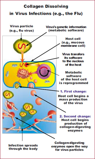 The virus also sends biological signals to the host cell to produce and secrete collagen-digesting enzymes. The collagen-digesting enzymes then start dissolving the surrounding tissue. With the help of these enzymes the infection then can spread easily to other parts of the body. The more a virus is capable of using the metabolism of a host cell for these two purposes, the faster a virus infection will spread and the sicker a patient will feel.